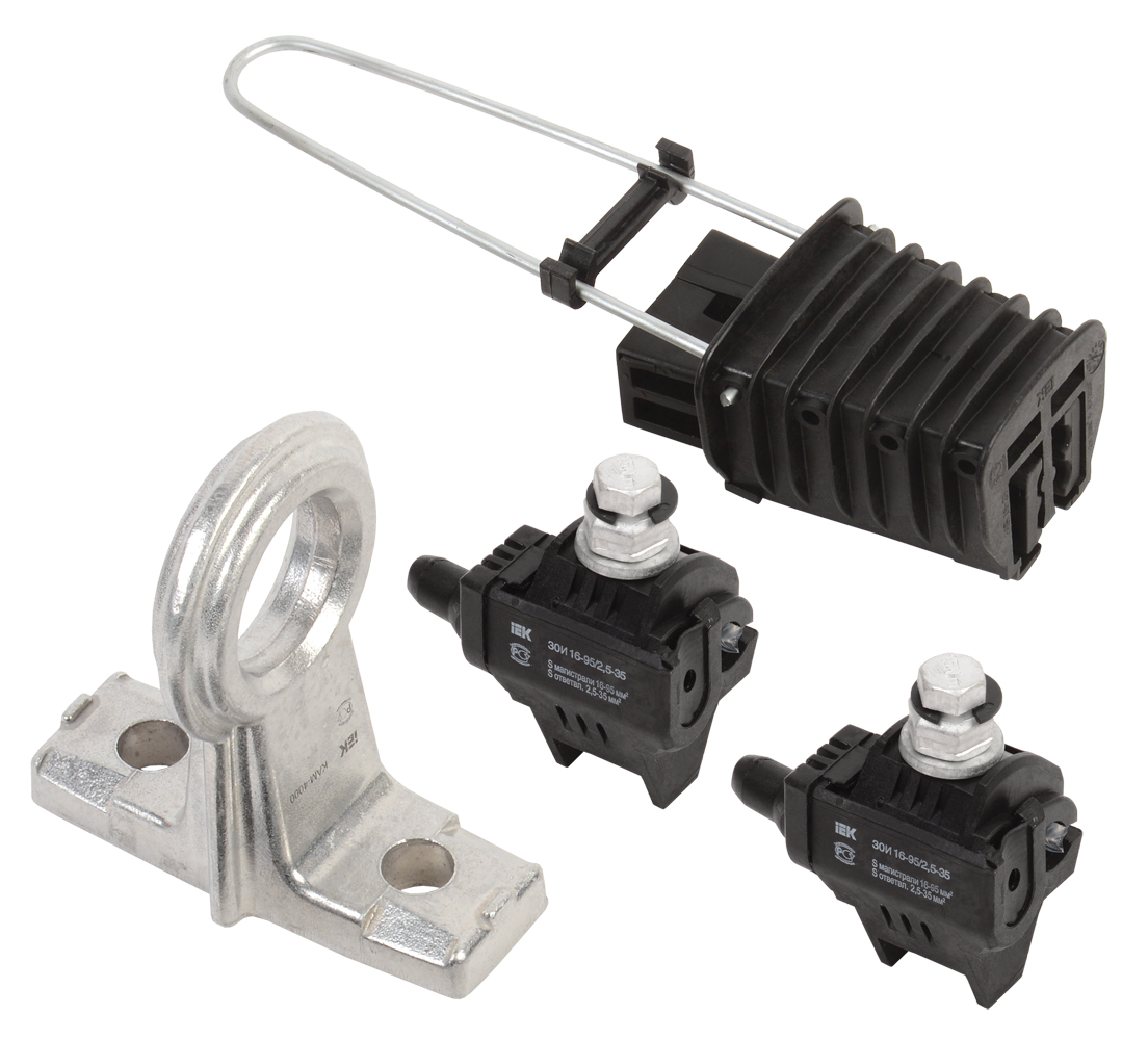 Комплект фасадного крепления типа КФК предназначен для промежуточного крепления и стяжки в пучок самонесущих изолированных проводов (СИП), напряжением до 1 кВ, на опорах и стенах зданий. Корпус изготовлен из полимера, устойчивого к ультрафиолетовому излучению и погодно-климатическим факторам. Дюбельная часть арматуры устанавливается в отверстие 012 мм, фиксируется гвоздем. Комплект КФК имеет специальный паз, позволяющий осуществить прокладку второй линии вдоль имеющейся трассы с помощью хомутов ХС.Комплект крепления к столбу КС-4 ИЭК включает в себя:
