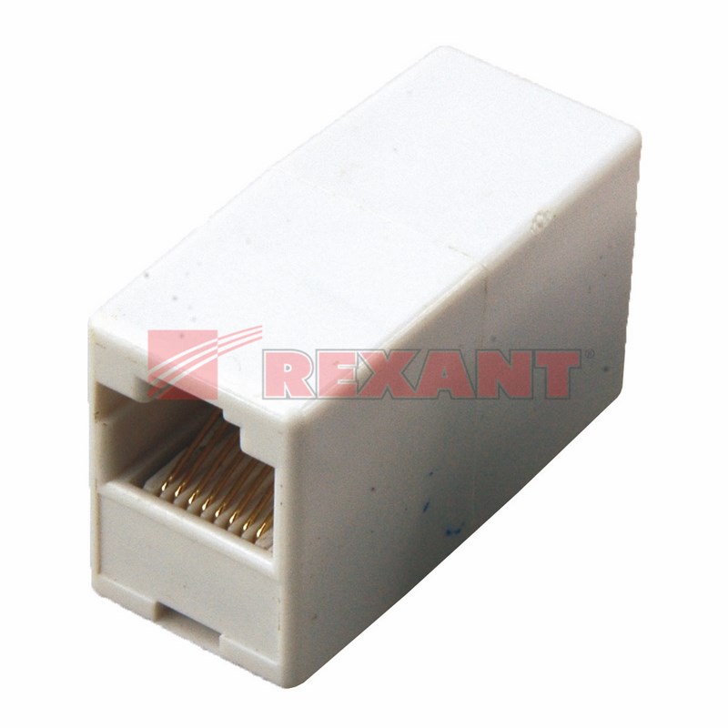 Проxодной адаптер белого цвета RJ-45 (8P8C) для соединения двуx оконцованныx компьютерныx кабелей.С каждой стороны устройства располагаются разъемы RJ-45, через которые осуществляется соединение кабелей между собой.