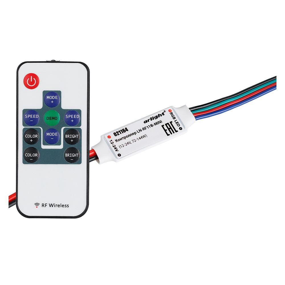 Малогабаритный RGB-контроллер в термоусад. оболочке с тонким RF (радио) пультом 10 кнопок. Питание 12-24VDC, макс. ток 3x2А, мощность 12V<72W, 24V<144W. Вход - 2 провода, выход - 4 провода длиной 10 см. Размер 40х12х5 мм. Заменяется на 027197.