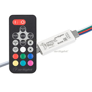 Контроллер серии "MINI". В комплекте контроллер, 18кн RF ПДУ черного цвета. Напряжение питания 5-24VDC, ток нагрузки 3x2A. Питание ПДУ 3V (CR2025). Габариты контроллера 51x14x6, габариты пульта 40x86x6.5.