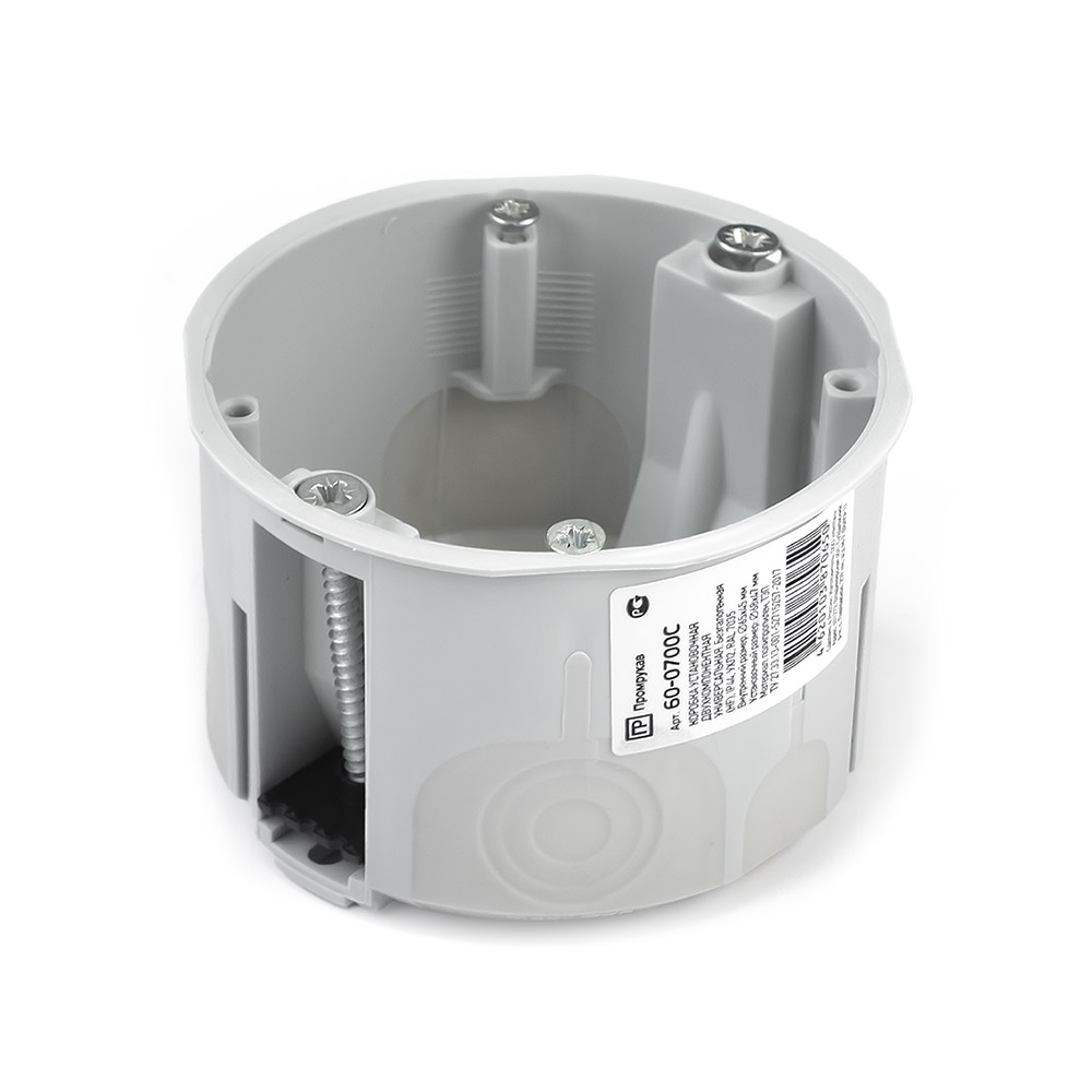 Коробка установочная 60-0700С предназначена для монтажа электрических розеток, выключателей и других электроустановочных изделий, при реализации скрытой проводки. Коробка установочная 60-0700С универсальная - подходит для всех типов стен. За счёт монолитной мембраны обеспечивается герметичный ввод (с высокой степенью защиты по IP) кабеля или кабеленесущей продукции. По необходимости, коробки установочные можно собрать в группу изделий за счёт переходника (PR80.0203 Переходник для коробки установочной двухкомпонентной чёрный Промрукав) и выполнить монтаж без снижения степени защиты по IP. Коробка изготовлена из тепло- и огнестойких изоляционныхматериалов в соответствии c ГОСТ 32126.1-2013 (испытание методом раскаленной проволоки при температуре 650 ℃).