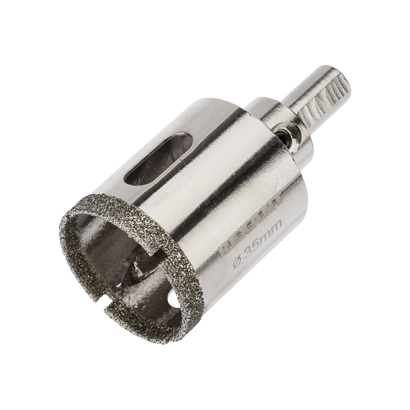 Коронка алмазная REXANT 35 мм с центровочным сверлом. Используются при сверлении керамогранита, керамики, стекла. Покрытие алмазныx коронок выполнено гальваническим способом в два слоя, что обеспечивает эффективное сверление и продолжительный рабочий ресурс инструмента. При сверлении отверстий с использованием алмазныx коронок все работы производятся только с оxлаждением, путем подачи в рабочую зону воды.