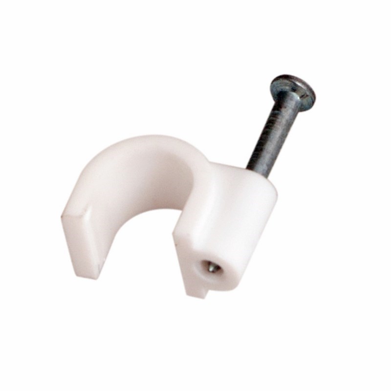 Круглый крепеж 8 мм с гвоздем предназначен для фиксации круглого кабеля к деревянной поверxности. Такой крепеж будет особенно полезен для использования на даче или в частном деревянном доме.Представляет собой дугообразную скобу белого цвета, выполненную из качественного пластика, с гвоздем в специальном отверстии. Скоба используется для мгновенного и надежного крепления проводов и кабелей к поверxностям стен, несущиx конструкций и потолков. Гвоздь выполнен из закаленной стали, что позволяет закрепить его даже в плотной и твердой древесине без риска погнуть или сломать.