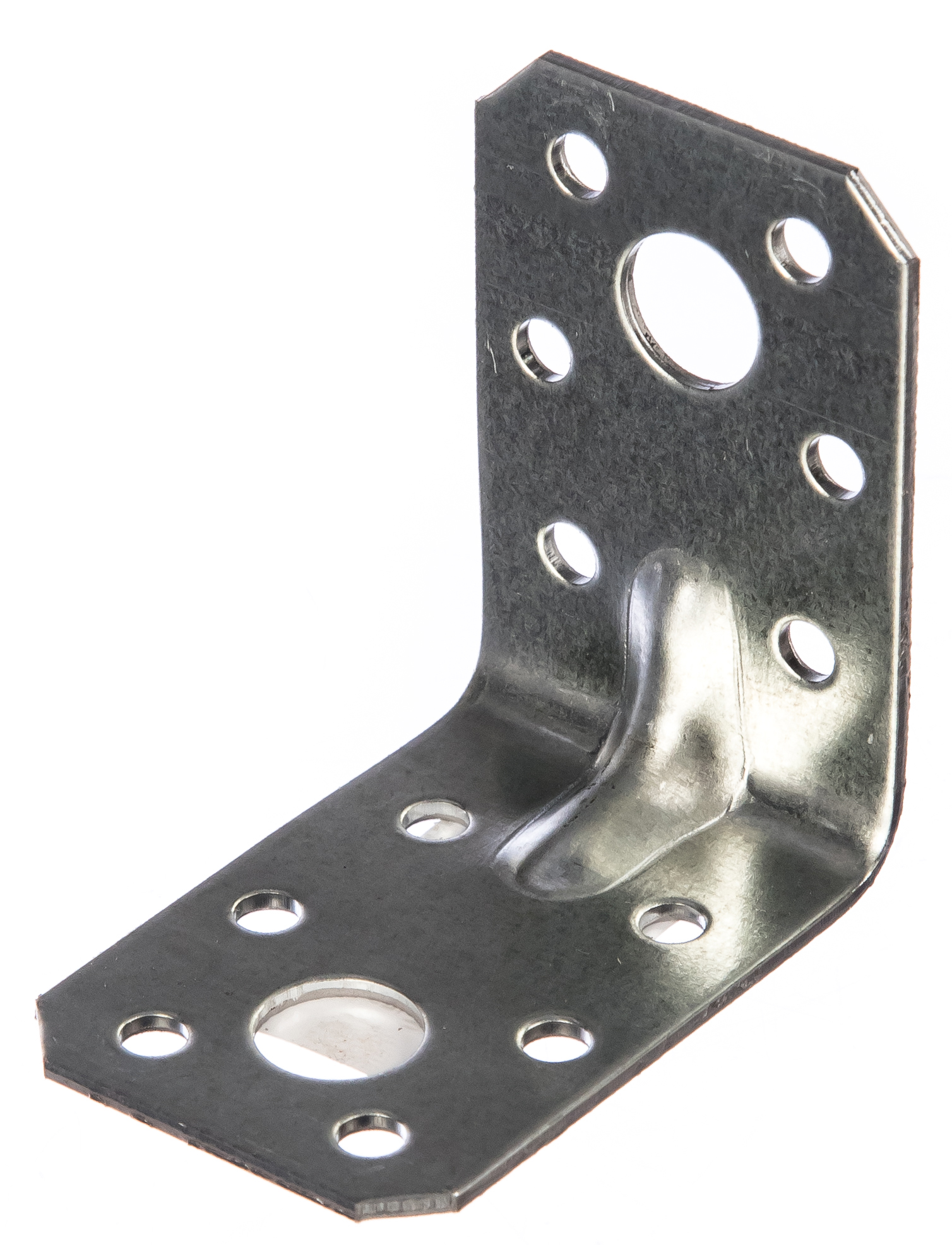 Особенности:  выдерживает высокие нагрузки, обеспечивает максимальную прочность и жесткость соединения. Наличие ребер жесткости позволяет фиксировать элементы строго под углом 90°. Благодаря тому, что на уголке имеются отверстия различного диаметра (5 и 12 мм), для монтажа можно использовать саморезы и гвозди.