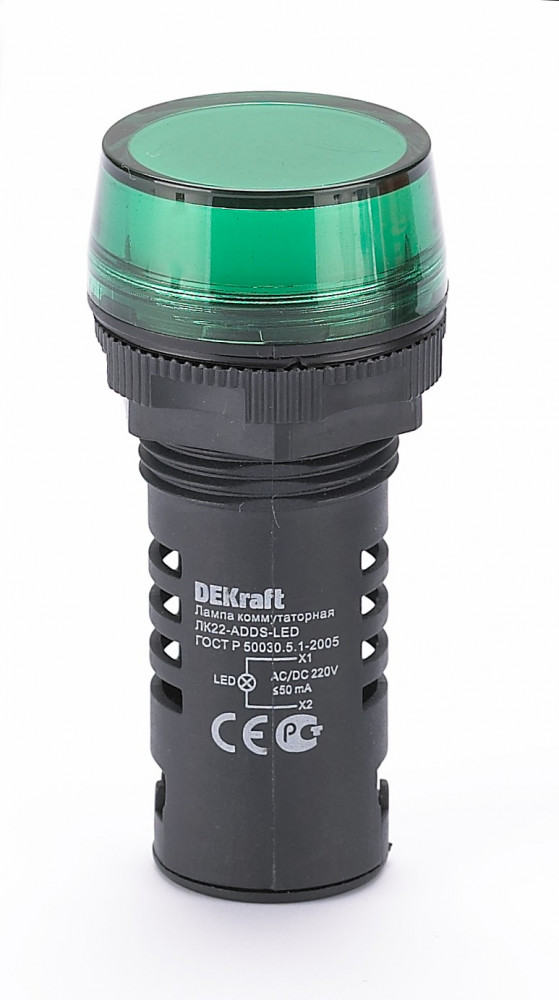Лампа сигнальная ADDS серии ЛК-22 DEKraft; светодиодная; зеленая; круглая; номинальное напряжение 220 В пер./пост.тока; установка - на панели или двери; степень защиты - IP54. Лампы сигнальные предназначены для индикации состояния электрических цепей и коммутационных аппаратов. Использование в лампах светодиодных матриц (LED) снижает потребление электроэнергии. Низкая чувствительность к колебаниям напряжения позволяет использовать их в электрических цепях с нестабильным напряжением.