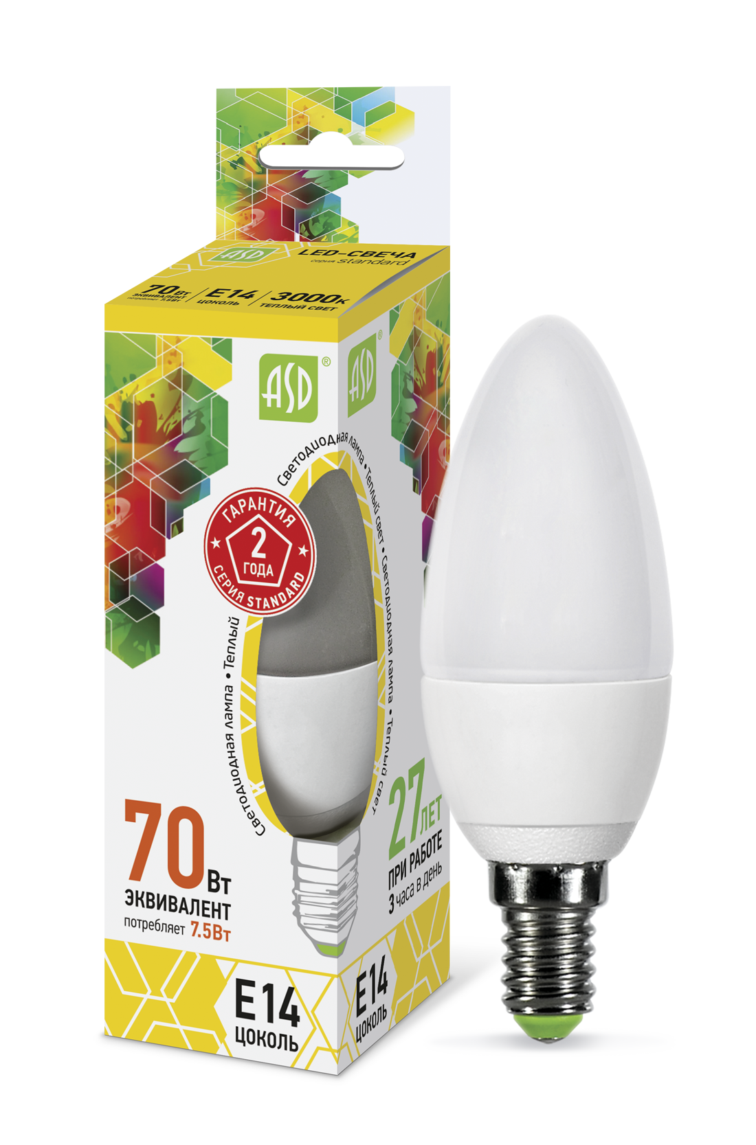 Лампа LED ASD C37 7,5W 220V 3000К E14 Standart 10/50