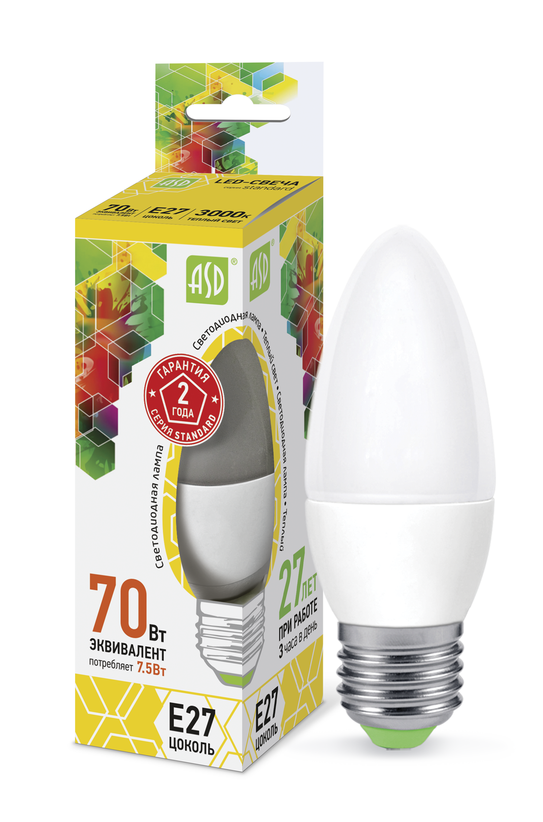 Лампа LED ASD C37 7,5W 220V 3000К E27 Standart 10/50