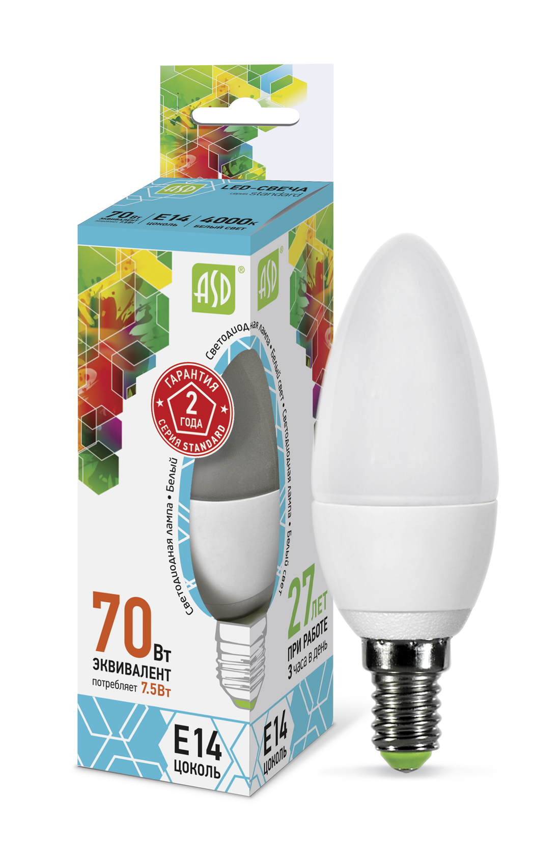Лампа LED ASD C37 7,5W 220V 4000К E14 Standart 10/50