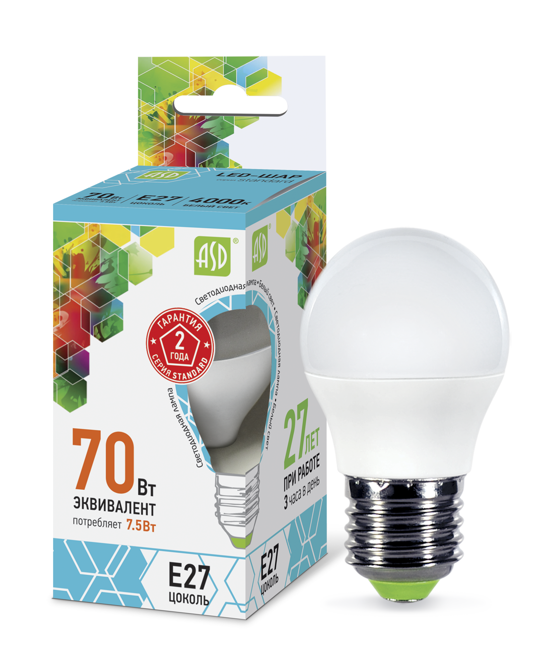Лампа LED ASD P45 7,5W 220V 4000К E27 Standard 10/50