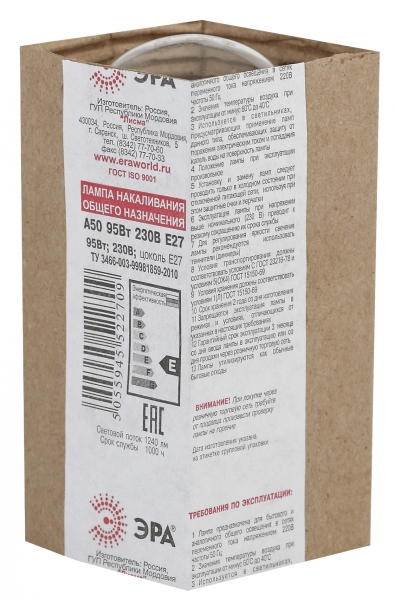 Лампа накаливания А50 95Вт 230В Е27 прозрачная ЭРА