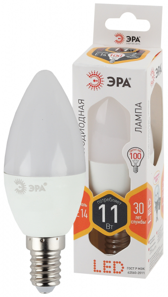 Лампа светодиодная B35 11W 220V 2700K E14 ЭРА 10/100