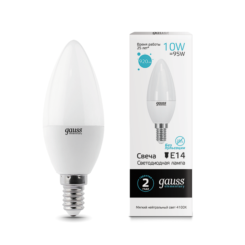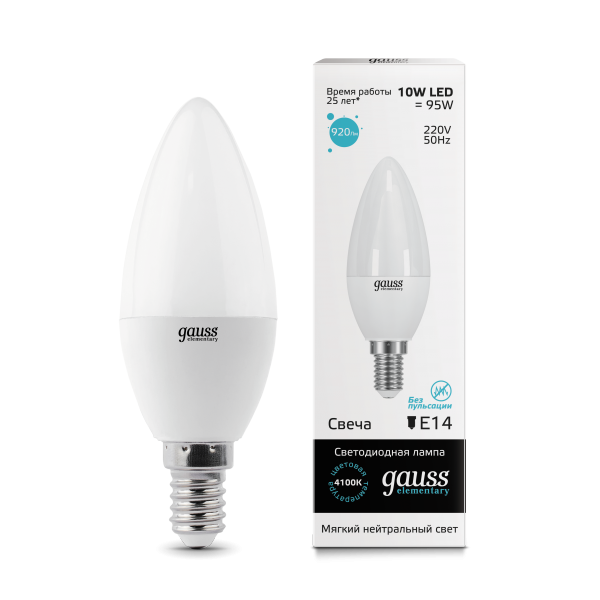 Светодиодные лампы Gauss Elementary Candle созданы в форме свечи. Лампы подойдут как для домашнего, так и для коммерческого использования. Такой тип освещения прекрасно смотрится в светильниках без плафонов или устанавливается в люстры и бра. Модель обладает широким диапазоном цветовых температур и мощностей, что поможет создать атмосферу тепла и уюта или концентрации. Равномерный спектр света создает зрительный комфорт в любом помещении. Данный тип освещения от Gauss обеспечивают стабильную работу в течение всего срока службы.
