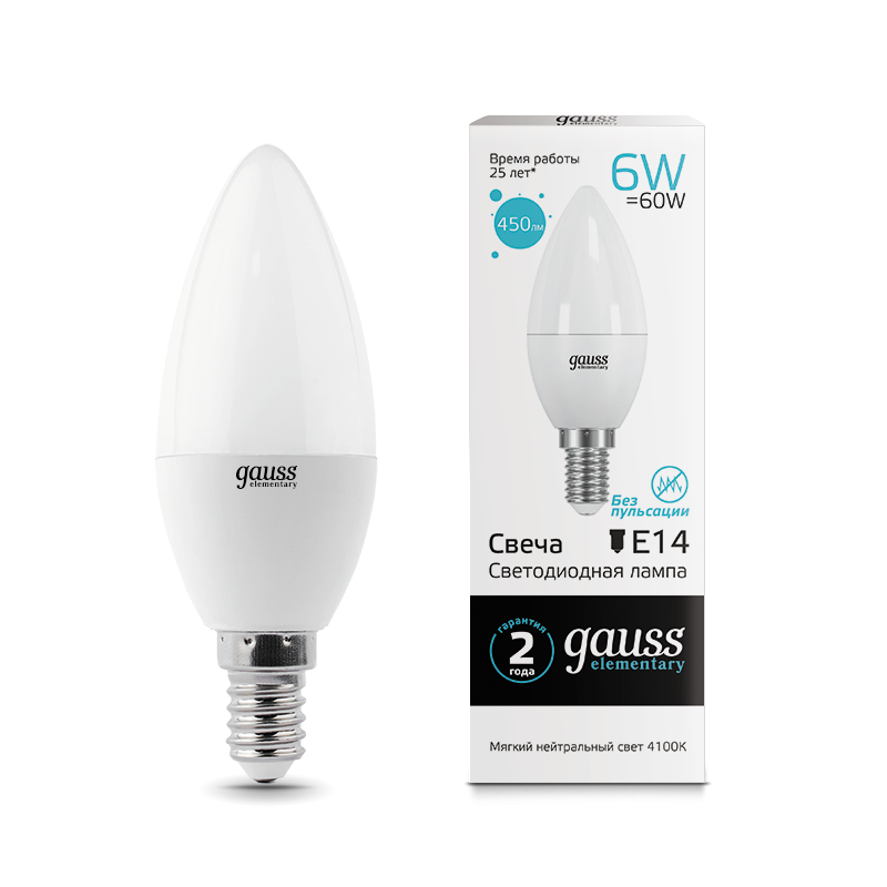Светодиодные лампы Gauss Elementary Candle созданы в форме свечи. Лампы подойдут как для домашнего, так и для коммерческого использования. Такой тип освещения прекрасно смотрится в светильниках без плафонов или устанавливается в люстры и бра. Модель обладает широким диапазоном цветовых температур и мощностей, что поможет создать атмосферу тепла и уюта или концентрации. Равномерный спектр света создает зрительный комфорт в любом помещении. Данный тип освещения от Gauss обеспечивают стабильную работу в течение всего срока службы.