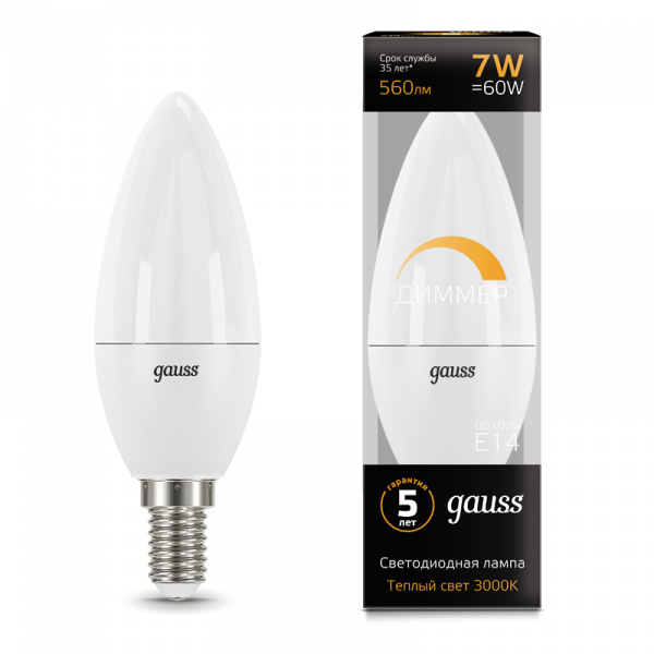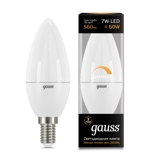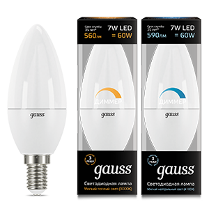 Лампа светодиодная C35 7W 220V 3000К E14 Gauss Candle dimmable 1/10/100