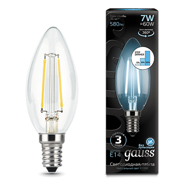 Лампа светодиодная C35 7W 220V E14 4100К Gauss Candle step dimmable Filament 1/10/50