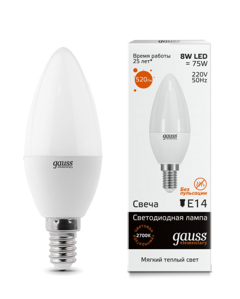 Светодиодные лампы Gauss Elementary Candle созданы в форме свечи. Лампы подойдут как для домашнего, так и для коммерческого использования. Такой тип освещения прекрасно смотрится в светильниках без плафонов или устанавливается в люстры и бра. Модель обладает широким диапазоном цветовых температур и мощностей, что поможет создать атмосферу тепла и уюта или концентрации. Равномерный спектр света создает зрительный комфорт в любом помещении. Данный тип освещения от Gauss обеспечивают стабильную работу в течение всего срока службы.