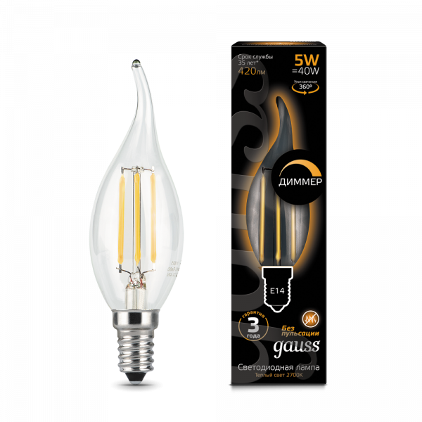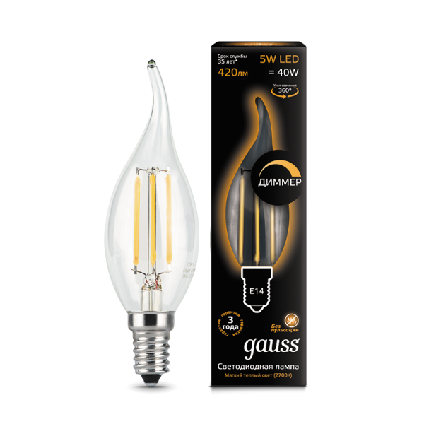 Лампа светодиодная C37T 5W 220V E14 2700K Gauss dimmable Filament Candle tailed 1/10/50