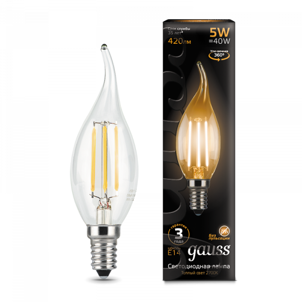 Лампа светодиодная C37T 5W 220V E14 2700K Gauss Filament 1/10/50