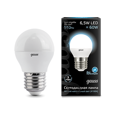 Лампа светодиодная G45 6,5W 220V E27 4100K Gauss Globe 1/10/100 *