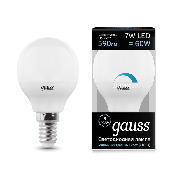 Лампа Gauss LED Шар-dim E14 7W 590lm 4100К диммируемая 1/10/100