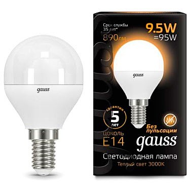 Светодиодные лампы Gauss Black в форме шара подойдут для большинства светильников, так как в категории присутствуют два вида цоколя. Светодиодные лампы Gauss Black активно используются для освещения жилых и офисных помещений. Лампы излучают приятный свет, который комфортен для глаз, без эффекта пульсации. Матовая колба ламп равномерно рассеивает свет и подходит для открытых светильников и прозрачных плафонов. Все лампы Gauss при колебаниях напряжения лампы не теряют яркость и не мерцают.
