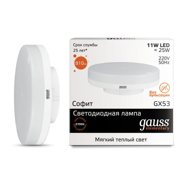 Лампа Gauss Elementary GX53 позволит наслаждаться приятным верхним светом, не утомляющим глаза когда нужно сконцентрироваться на задаче, но и не мешающим расслабиться в свой час.Благодаря теплой цветовой температуре 3000K, вы получите естественное дневное освещение, несущее комфорт и спокойствие.