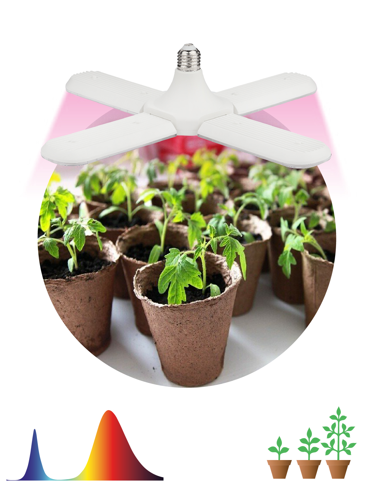 Фитолампа-трансформер Е27 красно-синего спектра мощностью 36 Вт способна осветить несколько квадратных метров рассады с высокой эффективностью. Рекомендованная высота от лампы до листьев от 15 до 75 см. Регулировка поворота лепестков лампы на 180 градусов. Для получения сконцентрированного светового потока расположите лепестки под 90 градусов друг к другу. Прозрачный рассеиватель и белый глянцевый корпус лампы позволили сделать ее максимально энергоэффективной. Корпус из негорючего пластика. Лампа клевер ЭРА FITO-36W-RB-E27-FOLD на первый взгляд кажется странной и непривычной, но в лепестковой лампе за счет распределения печатных плат на большой площади проблема со съемом тепла с диодов решается намного легче и дешевле, чем в радиаторных лампах. В данном решении есть перфорация для съема тепла с блока питания лампы. Красно-синий спектр и эффективность лампы при этом не уступают стандартным решениям от компании ЭРА. Размеры: 98-393х250х100 мм.Эта удобная бытовая фитолампа-трансформер красно-синего спектра по своей мощности и эффективности не уступает профессиональному фитопрожектору. Обеспечивает качественную досветку 2 кв м рассады. Мягкий фиолетовый свет комфортен для глаз человека. Поворотные лепестки позволяют быстро и без усилий изменить направление и интенсивность освещения конкретных растений. Эффектный внешний вид и максимальный комфорт в применении. На каждом лепестке по 40 светодиодов. Каждый лепесток поворачивается на 180 градусов. Индивидуальное регулирование наклона и направления светодиодных "лепестков" дает возможность создать множество уникальных сценариев подсветки растений.