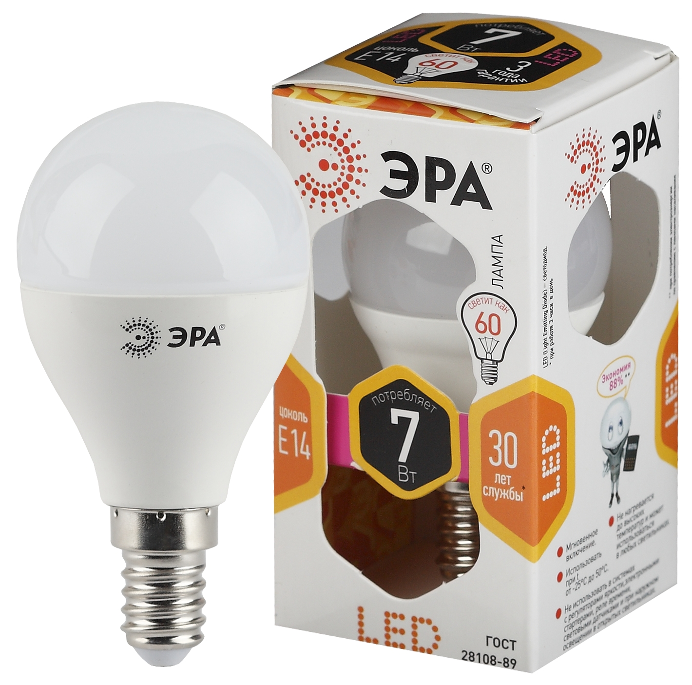 Лампа светодиодная (LED) «шар» d45мм E14 270° 7Вт 170-265В матовая тепло-белая 2700К ЭРА (Энергия света)