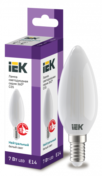 Лампа LED C35 свеча матов. 7Вт 230В 4000К E14 серия 360° IEK с нитевидным светодиодом (филаментная нить) является одним из самых эффективных источников света.Главное отличие от обычных светодиодных ламп – угол рассеивания света до 360° (дополнительный комфорт для глаз). Лампа применяется в осветительных приборах бытового назначения. Представлены в 3 вариантах: с прозрачной, золоченой и матовой колбами.