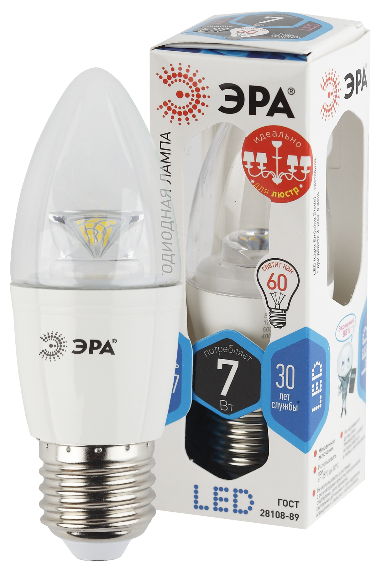Лампа светодиодная (LED) «свеча» d37мм E27 270° 7Вт 170-265В прозрачная нейтральная холодно-белая 4000К ЭРА (Энергия света)