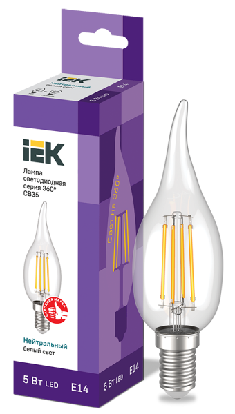 Лампа LED CВ35 св.н/ветру 5Вт 230В 4000К E14 серия 360° IEK с нитевидным светодиодом (филаментная нить) является одним из самых эффективных источников света.Главное отличие от обычных светодиодных ламп – угол рассеивания света до 360° (дополнительный комфорт для глаз). Лампа применяется в осветительных приборах бытового назначения. Представлены в 3 вариантах: с прозрачной, золоченой и матовой колбами.