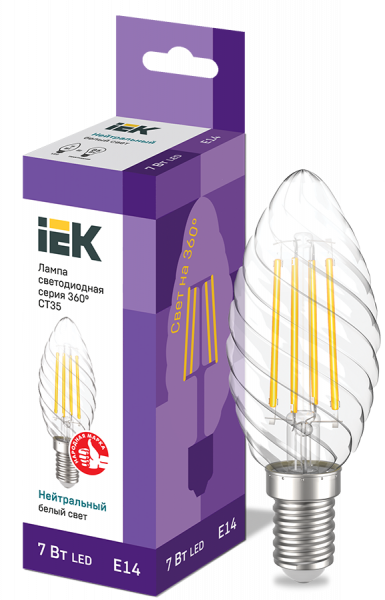 Лампа LED CT35 свеча вит. 7Вт 230В 4000К E14 серия 360° IEK с нитевидным светодиодом (филаментная нить) является одним из самых эффективных источников света.Главное отличие от обычных светодиодных ламп – угол рассеивания света до 360° (дополнительный комфорт для глаз). Лампа применяется в осветительных приборах бытового назначения. Представлены в 3 вариантах: с прозрачной, золоченой и матовой колбами.