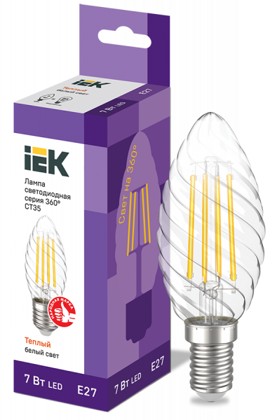 Лампа LED CT35 свеча вит. 7Вт 230В 3000К E27 серия 360° IEK с нитевидным светодиодом (филаментная нить) является одним из самых эффективных источников света.Главное отличие от обычных светодиодных ламп – угол рассеивания света до 360° (дополнительный комфорт для глаз). Лампа применяется в осветительных приборах бытового назначения. Представлены в 3 вариантах: с прозрачной, золоченой и матовой колбами.