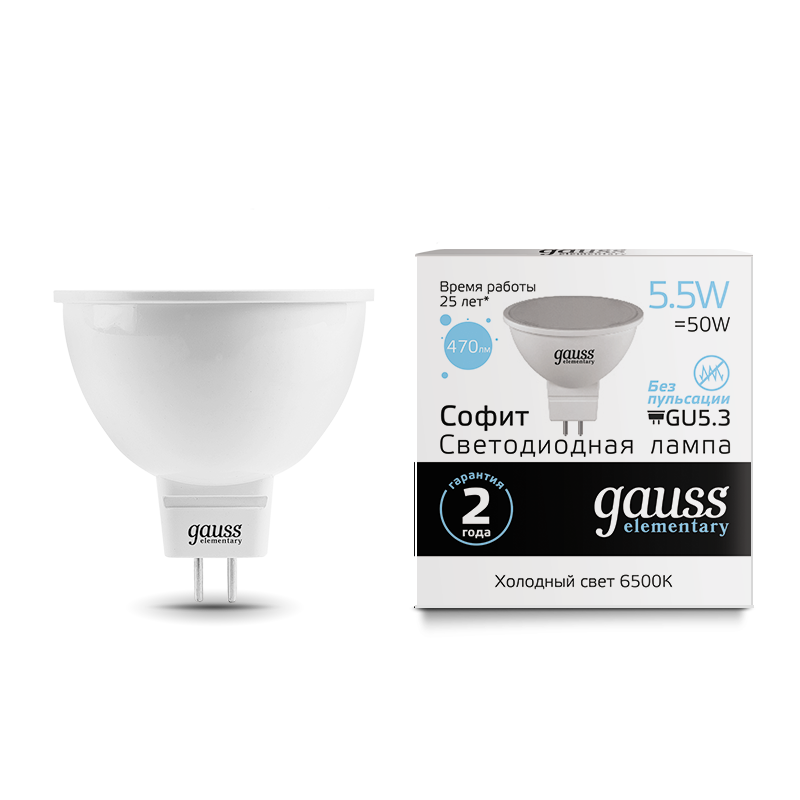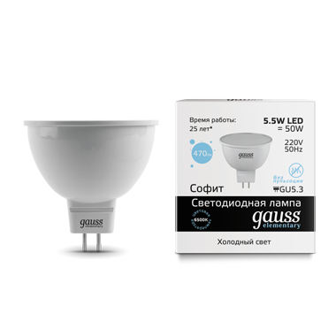 Лампа Gauss Elementary MR16 сочетает актуальные технологии и дизайн, чтобы сделать ваше пространство гармоничнее. С яркостью в 470 люменов она требует самый минимум электроэнергии для полноценного освещения рабочей области. Цветовая температура 6500К будет уместна при решении важных, требующих внимания задач на кухне, в спортзале, мастерской. Хороша для коммерческих помещений.Продукцию Gauss выбирают когда хотят преобразить пространство и жизнь, сэкономить как свои финансы, так и природные ресурсы.
