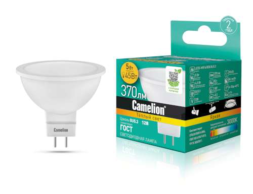 Лампа светодиодная MR16 5W 12V 3000К GU5,3 Camelion 10/100