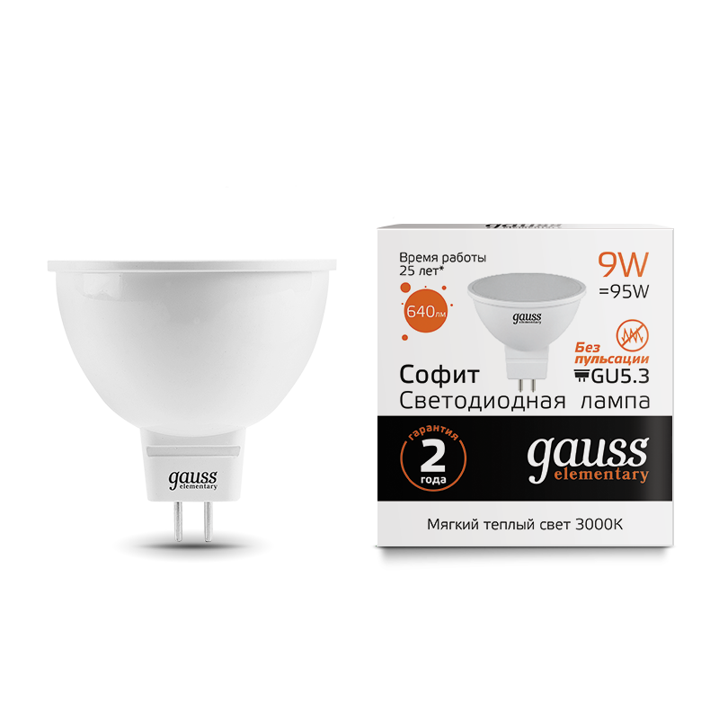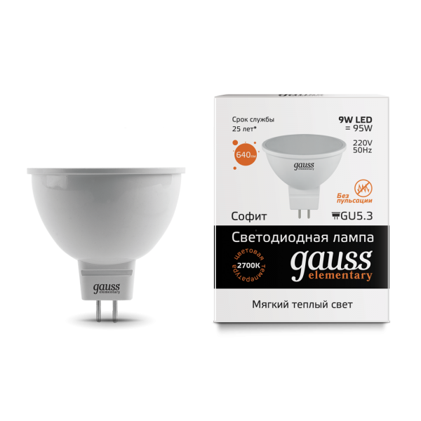 Лампа Gauss Elementary MR16 превратит любое помещение в пространство комфорта и уюта. С яркостью 640 люменов и эффективной мощностью 9W, она подойдет для освещения как домашних, так и рабочих пространств.Ее теплый свет без утомляющей пульсации, цветовой температурой 3000K, помогает расслабиться.