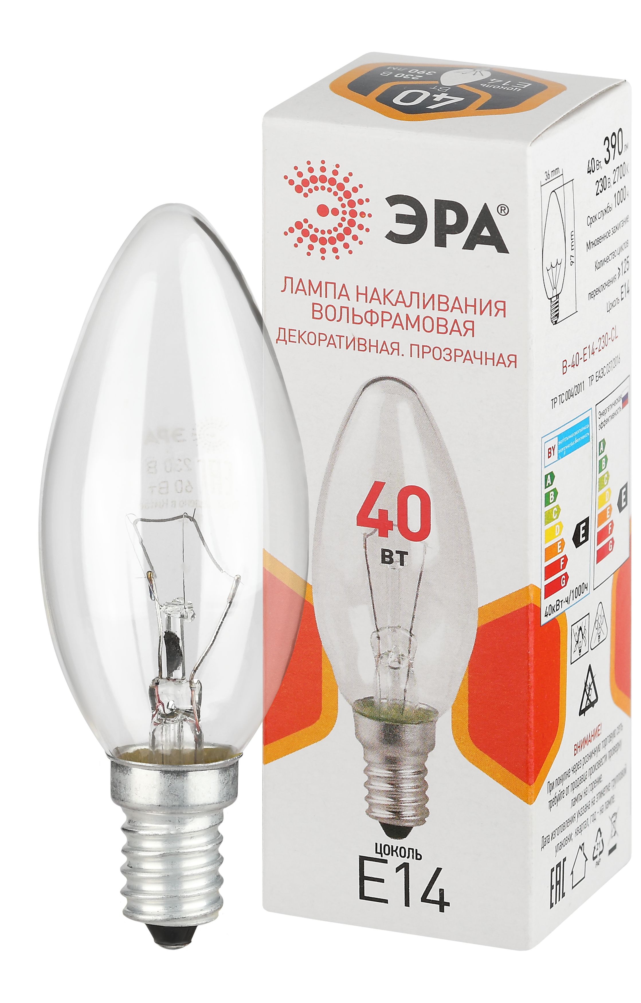 Лампочка ЭРА B36 40Вт Е14 / E14 230В свечка прозрачная (КНР)