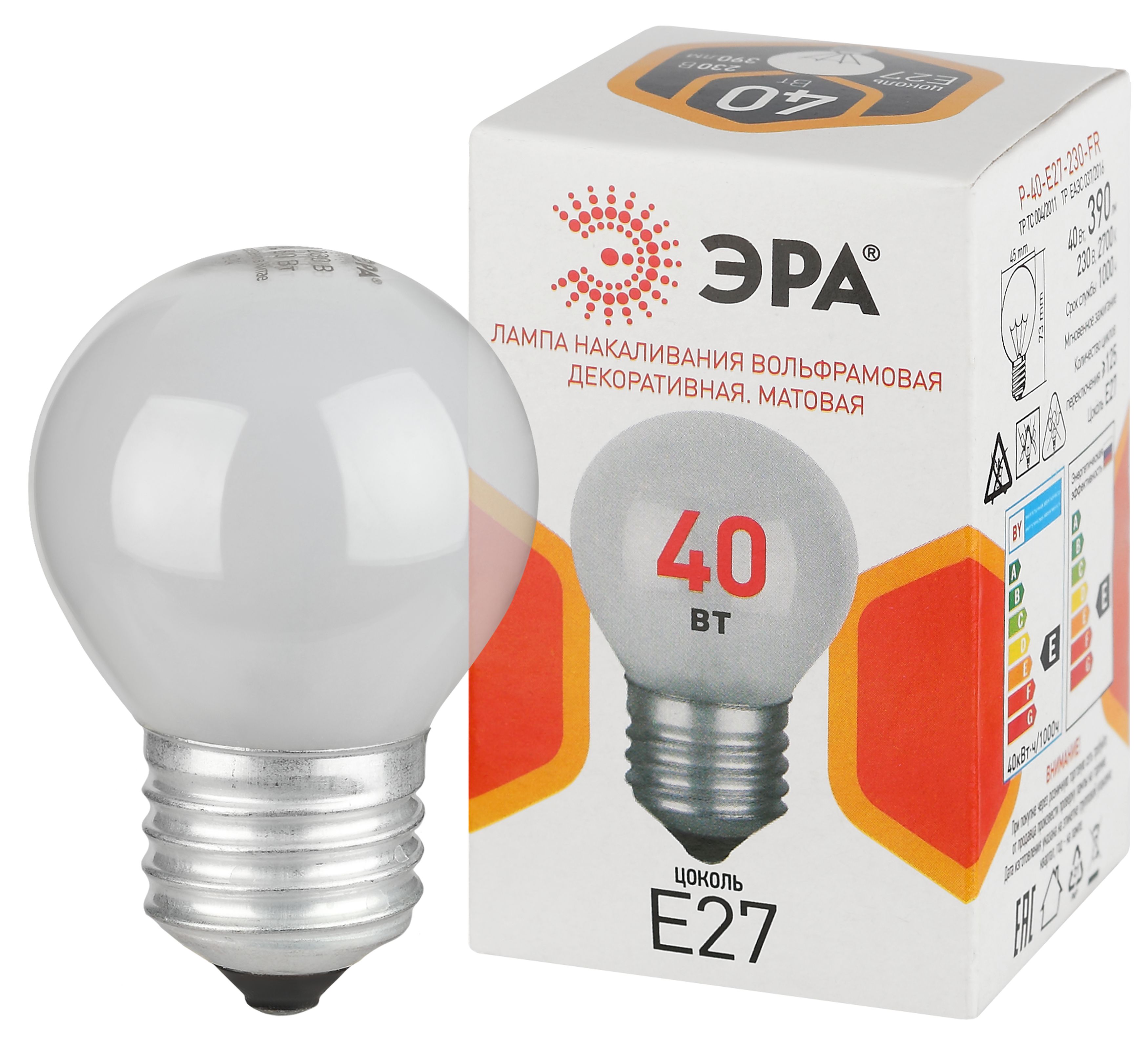 Лампочка ЭРА P45 40Вт Е27 / E27 230В шар матовый (КНР)