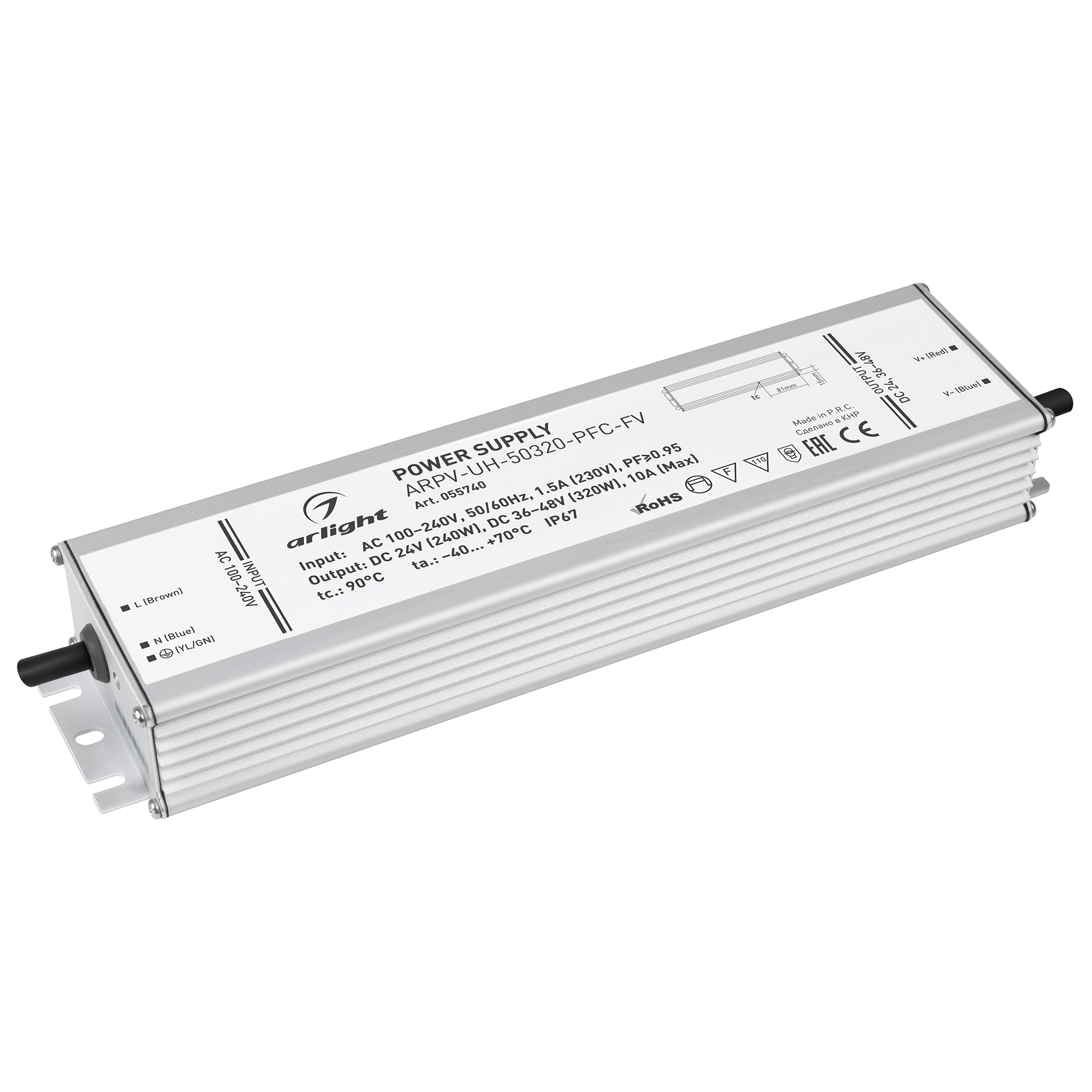 Регулируемый источник напряжения гальванической развязкой для светодиодных изделий. Входное напряжение 100-240 VAC. Выходные параметры: 24В 240Вт, 36-48В 320Вт, 10 А max. Переключение напряжения 24-36-48В с помощью кнопки на корпусе. Подстройка с шагом 0.5В. Встроенный PFC >0,95. Герметичный алюминиевый корпус IP 67. Рабочая температура -40… 70C°. Габаритные размеры длина 281 мм, ширина 68 мм, высота 38.5 мм. Гарантийный срок 7 лет.