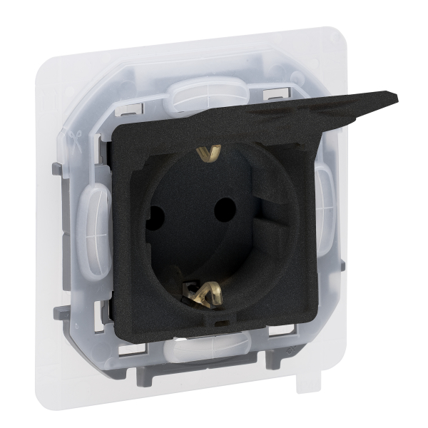 Розетка с заземлением, защитной крышкой и интегрированными защитными шторками для скрытого монтажа Legrand/Daccord Inspiria, степень пылевлагозащиты IP44, цвет "Антрацит", номинальный ток 16А, напряжение ~250В, максимальная мощность 3680 Вт, винтовые зажимы.Применяется для присоединения однофазных электрических потребителей к сети переменного тока в зданиях с проводкой с заземлением (с защитным проводником). Предназначена для установки в местах с повышенной влажностью. Оснащена интегрированными шторками, которые защищают детей и других пользователей от удара электрическим током.