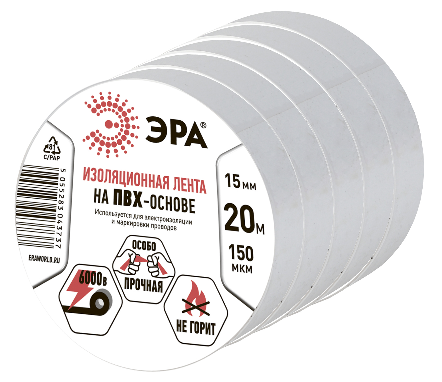 Набор из 5 шт. изолент ПВХ белая 15мм х 20мИзолента ЭРА изготовлена из высококачественного негорючего ПВХ. Представляет собой расходный материал для проведения бытовых и строительных электромонтажных работ. Используется для электроизоляции, в целях маркировки, а также для защиты от механических повреждений, воздействия влаги и пр. Устойчива к воздействию УФ-лучей, влажности, истиранию, коррозии металлов, старению. Клеевой слой на резиновой основе. Изолента выпускается в рулонах по 20 м. Восемь вариантов цветов серый, синий, белый, красный, желтый, зеленый, черный, желто-зеленый.