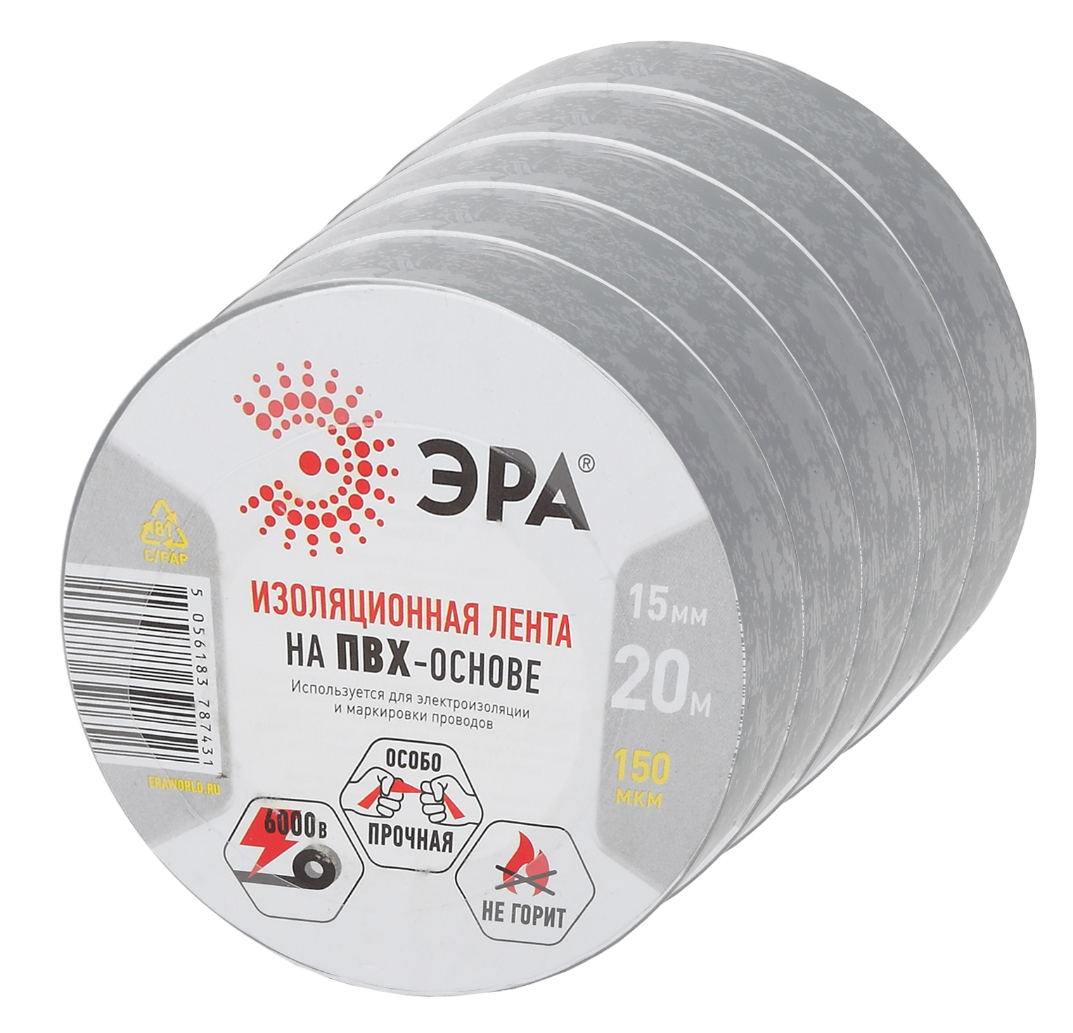 Набор из 5 шт. изолент ПВХ серая 15мм х 20мИзолента ЭРА изготовлена из высококачественного негорючего ПВХ. Представляет собой расходный материал для проведения бытовых и строительных электромонтажных работ. Используется для электроизоляции, в целях маркировки, а также для защиты от механических повреждений, воздействия влаги и пр. Устойчива к воздействию УФ-лучей, влажности, истиранию, коррозии металлов, старению. Клеевой слой на резиновой основе. Изолента выпускается в рулонах по 20 м. Восемь вариантов цветов серый, синий, белый, красный, желтый, зеленый, черный, желто-зеленый.