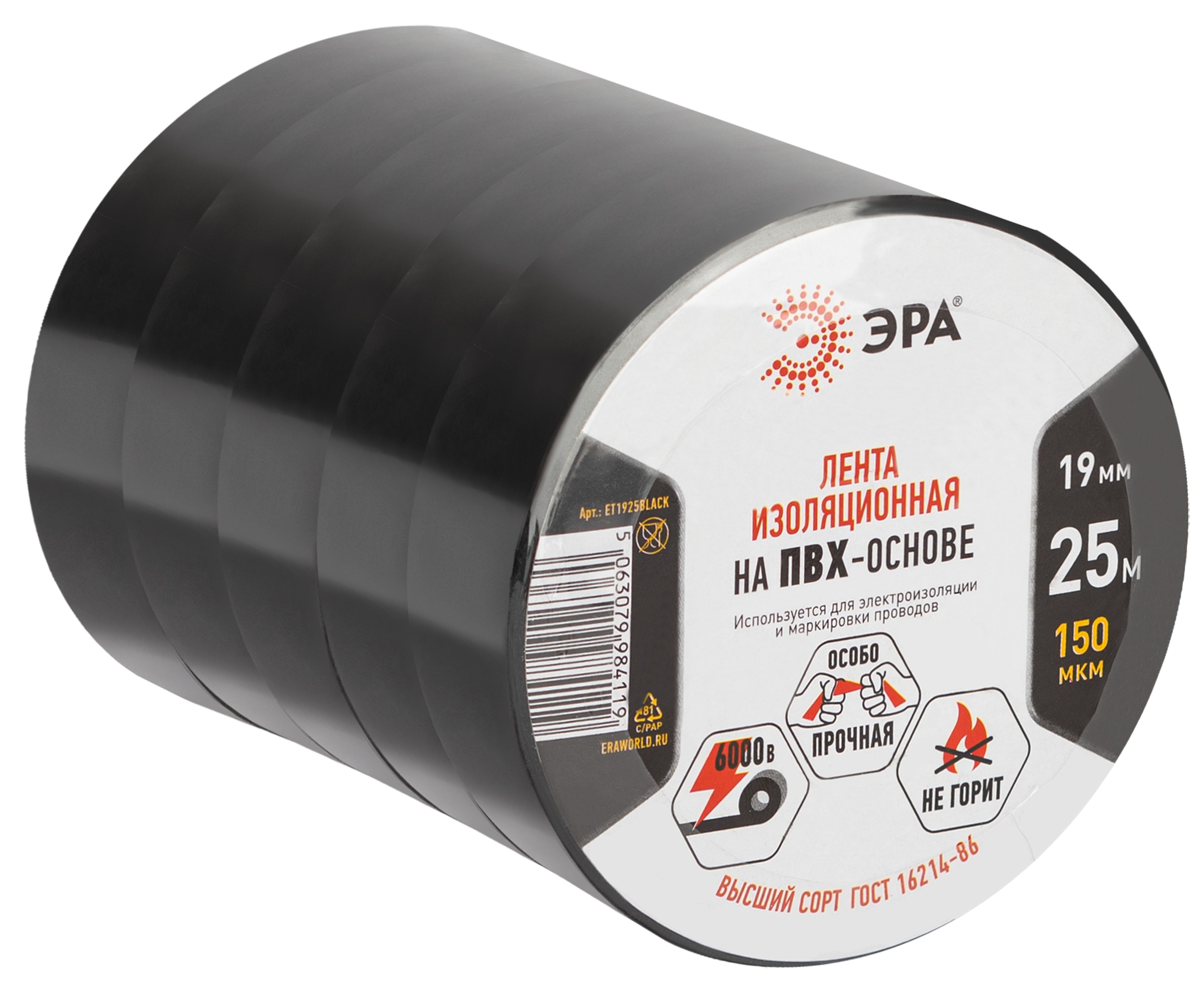 Набор 5 шт черных ПВХ-изолент предназначена для электроизоляции и маркировки проводов. Используется при проведении ремонтных работ в промышленных условиях, в быту, в автомобиле. Изоляционная лента может пригодиться и в бытовых ситуациях. Отличается надежностью, прочностью и высоким качеством. Соответствует требованиям ГОСТ 16214 86. Высокий уровень надежности материала можно оценить в показателе растяжения / удлинения поливинилхлоридной ленты. Изоленту для проводки можно применять в условиях разной сложности. Она прекрасно выдерживает различные механические воздействия. ПВХ материал имеет защиту от пробоя. Изоляционная лента используется для создания герметичной защиты электрических соединений, полностью предотвращая возможность поражения электрическим током, препятствует возникновению короткого замыкания и возгорания. Длина намотки ролика – 25 м. Ширина – 19 мм. Диапазон рабочих температур – от -50 до +70C. Изолента может быть использована в уличных условиях, либо внутри помещения. Изолента / клейкая лента / скотч 19мм х 25м черная.