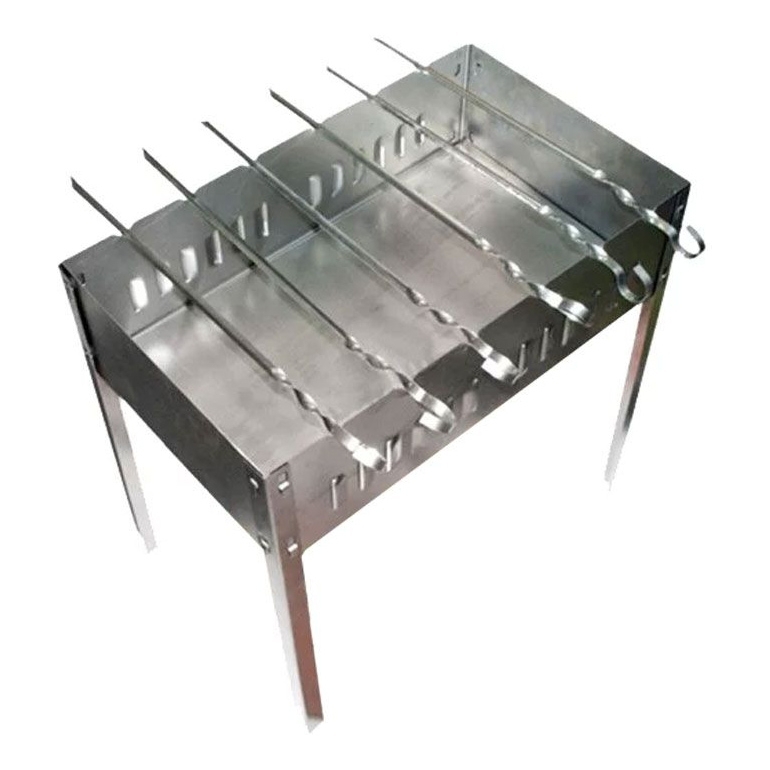 Мангал сборный "ЭКОНОМ" в гофрированной картонной коробке с шампурами. Размер 400*250*400мм. Толщина листов 0,5мм. В комплекте 6 угловых шампуров размером 370*10*0,8мм.