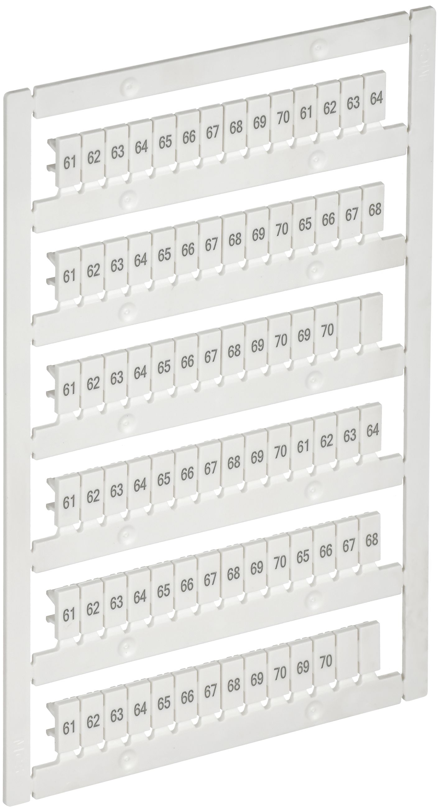 Маркеры ARMAFIX используются для маркировки рядов клеммных колодок ARMAFIX в системах распределения. Устанавливаются в соответствующие пазы клеммы. Выполнены в виде пластин. Каждая мини пластина может отсоединяться друг от друга. Совместимы с клеммами ARMAFIX различных серий. На маркерах нанесены обозначения цифровые символы, указанные в описании артикула. Печать выполнена способом, который обеспечивает долговечную и нестираемую маркировку. Изготавливаются из поликарбоната.