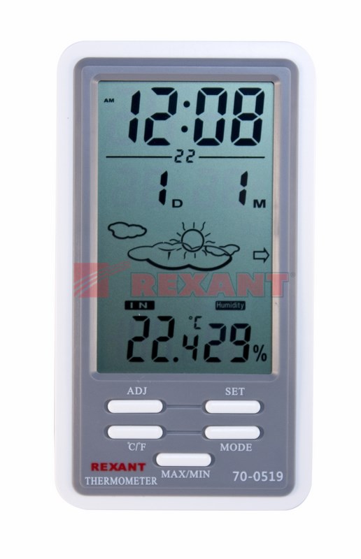 Комнатная метеостанция REXANT предназначена для измерения показаний температуры и влажности в помещении, имеет часы, календарь и функцию будильника. Регистрирует в памяти максимальное и минимальное значения температуры и влажности. Отображает общий уровень метеокомфорта в помещении. Имеет настольную подставку и отверстие для крепежа на стену. Имеет кнопку сброса параметров RESET.Характеристики: