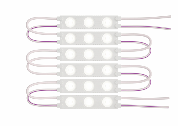 Светодиодные LED-модули - более универсальный аналог светодиодным лентам. В отличие от лент, их можно наклеивать под любыми углами на любую поверхность и свободно менять направление монтажа между каждым модулем.Цепочку LED-модулей можно обрезать после любого модуля без нарушения его работы по оставшейся длине.Это современный способ создания внутреннего освещения, подсветки ниш, лестничного пространства, систем хранения, а так же декоративного и художественного оформления любых объектов и любых форм.Легко и быстро устанавливается на любой гладкой поверхности с помощью скотча, расположенного на оборотной стороне модулей.Светодиодные модули закрытого типа в герметичном корпусе из ABS пластика с линзами и платой-радиатором.В упаковке находится 5 метровая лента из 40 модулей, на каждом модуле расположено по 3 светодиода с цветовой температурой 6500 К. Степень защиты модулей: IP65 применение внутри и снаружи помещений.