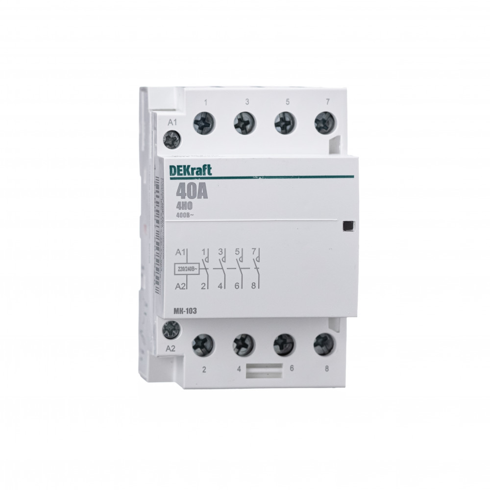 Модульный контактор серии МК-103 Dekraft; ном.ток 40 А (АС-7а); кол-во и исполнение контактов – 4НО; напряжение управления 220 В пер.тока; ширина – 3 мод. х 18 мм; установка – на DIN-рейку. Контакторы МК-103 применяются в сетях напряжением до 400 В пер.тока для дистанционного управления небольшими нагрузками, требующими большого количества включений / отключений, например, насосы, системы вентиляции и т.п. Модульные контакторы не требуют дополнительных настроек и специального обслуживания.
