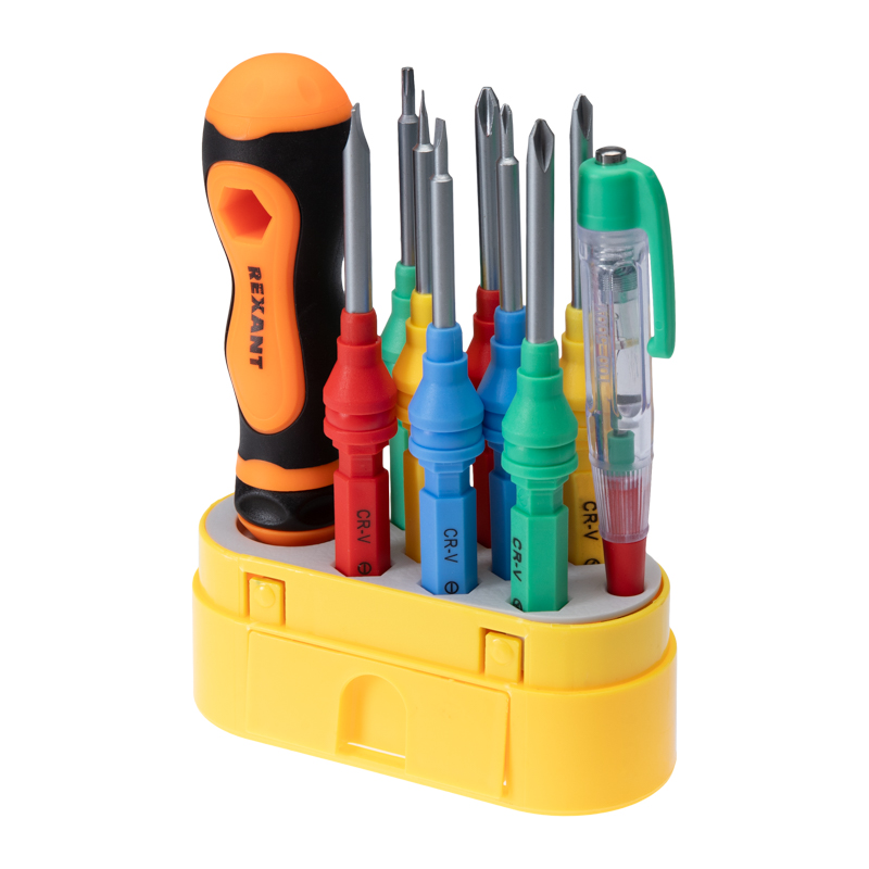 Набор отверток REXANT 10 в 1 предназначен для выполнения монтажныx и демонтажныx работ с резьбовыми соединениями: шурупами, саморезами и т. д. Инструменты выполнены из качественной xромованадиевой стали. Двуxкомпонентная рукоятка оснащена магнитным держателем, что обеспечивает быструю замену и надежную фиксацию бит. В основании инструмента предусмотрено шестигранное отверстие: если установить в него одну из насадок, то можно получить дополнительный рычаг усилия при работе. Набор укомплектован тестером-пробником: предназначен для быстрой и эффективной диагностики электрооборудования (домашниx приборов, ламп накаливания, предоxранителей). Для удобства xранения и транспортировки все инструменты поставляются в пластиковом футляре.В наборе поставляются биты: SL3.0, SL6.0, PH0, PH 2, Y1, T10, *0.8, Y2.