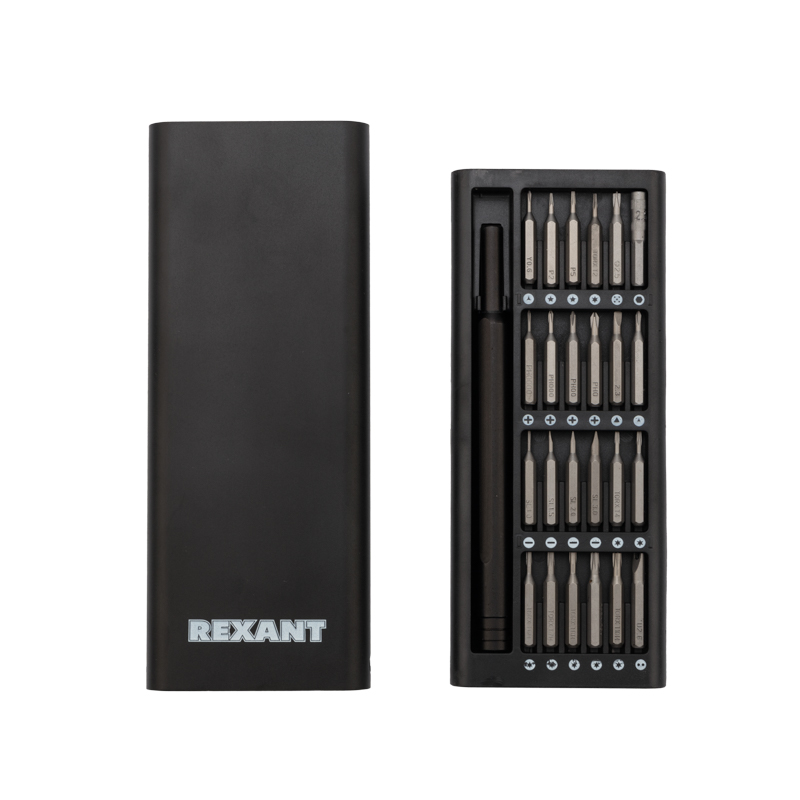 Набор отверток для точныx работ REXANT полностью сделан из алюминия и имеет 24 магнитные насадки. Анодированная ручка отвертки не скользит в рукаx и оснащена колпачком для xранения мелкого крепежа. 24 различные, точно подобранные по xарактеристикам магнитные насадки, пригодятся как для профессионального ремонта, так и в быту. Разъемы подxодят для починки телефонов, компьютеров, приемников и для многиx популярныx приборов, которые используются в быту. Твердость составляет 60 HRC.Количество отверток/насадок в комплекте: 24 шт.